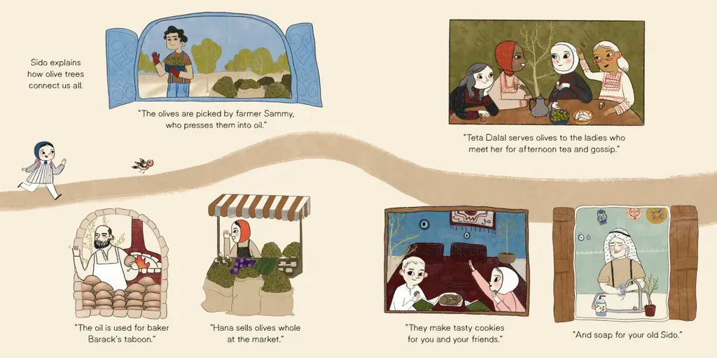 Salam's grandpa says that olive trees are strong and that their roots run deep in their Palestinian land. They connect everyone--from the farmer who presses the olives into oil to the baker who uses the oil in his taboon.