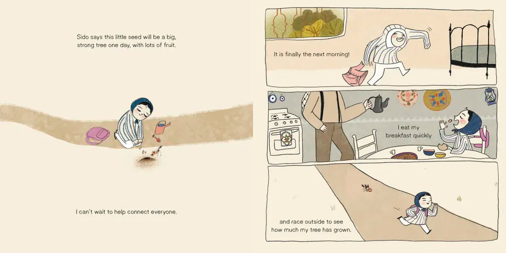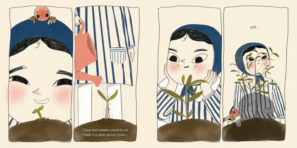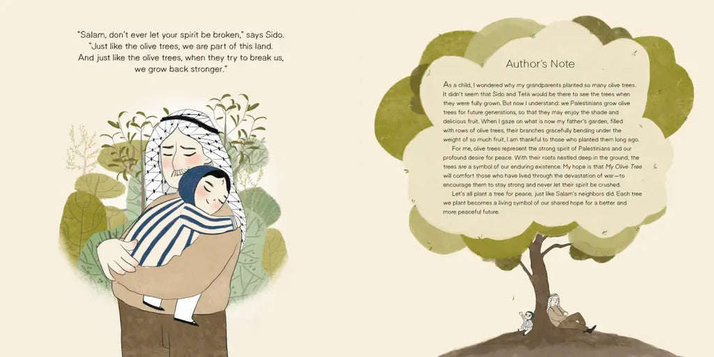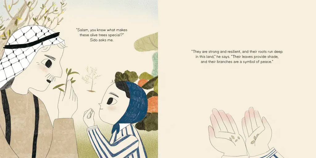 Salam plants her own seed and is eager to see it grow. She waits... she waters... she asks the seed to hurry... until finally...a sprout! But one day soldiers come and destroy everything in their path...including Salam's new olive tree. Salam is crushed--though she doesn't have to worry. Her grandpa gathers their neighbors and, together, they plant olive trees as far as the eye can see.