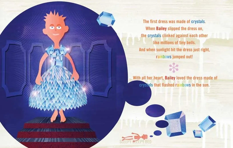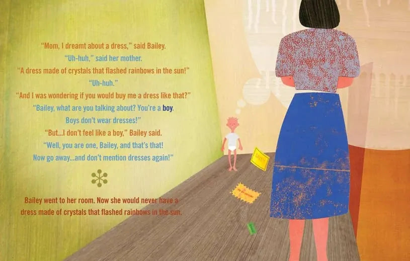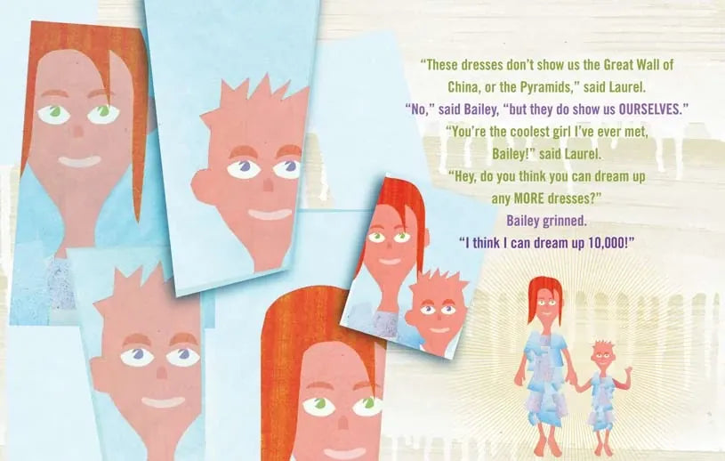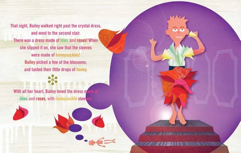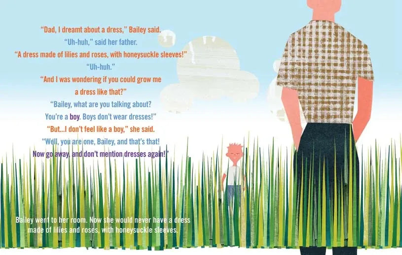 Every night, Bailey dreams about magical dresses: dresses made of crystals and rainbows, dresses made of flowers, dresses made of windows. . . . Unfortunately, when Bailey's awake, no one wants to hear about these beautiful dreams. Quite the contrary. "You're a BOY!" Mother and Father tell Bailey. "You shouldn't be thinking about dresses at all." Then Bailey meets Laurel, an older girl who is touched and inspired by Bailey's imagination and courage. In friendship, the two of them begin making dresses together. And Bailey's dreams come true!