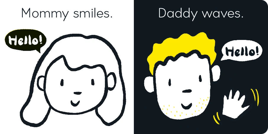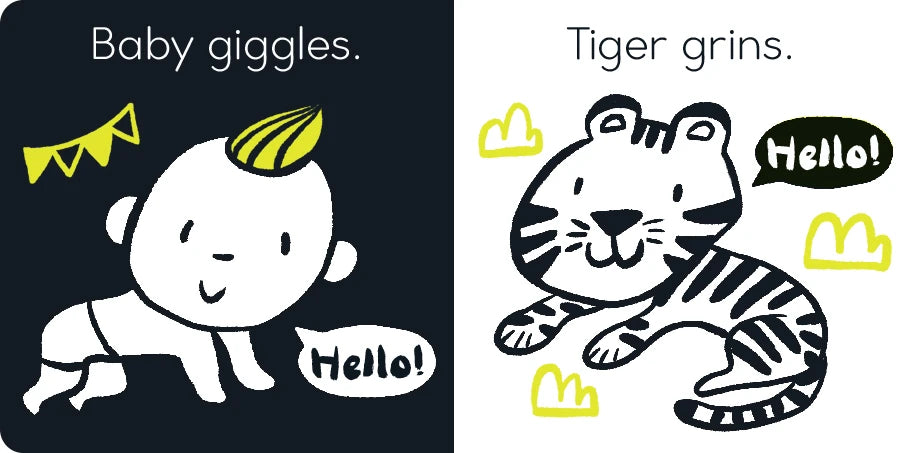 Babies will love to experience the appealing, black-and-white high-contrast images in this engaging board book. With a tactile die-cut cover and super-bright fluorescent inks on every page, which feature simple black-and-white illustrations, this series has been specially designed to capture your little one's attention. Babies will meet a host of friendly characters, such as Mommy smiling and Daddy waving, a tiger grinning, a monkey chattering, a lion roaring, and more fun animals and sounds.