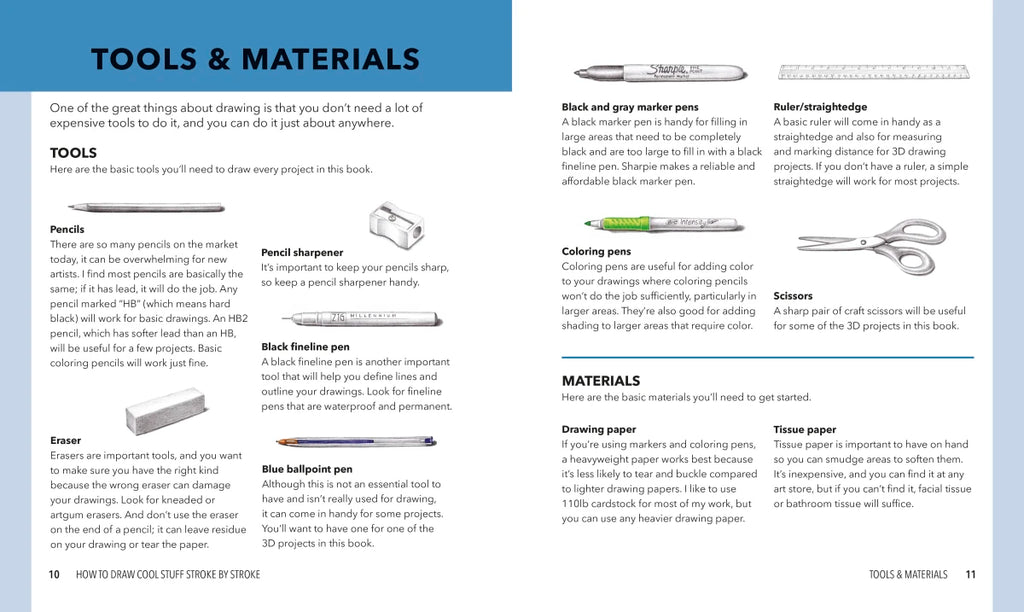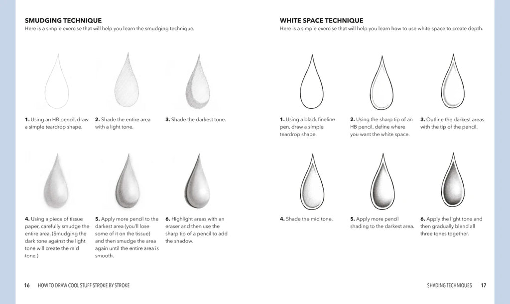 Simple tutorials for basic drawing skills like shading as well as creating textures and surfaces so readers can learn drawing the right way.