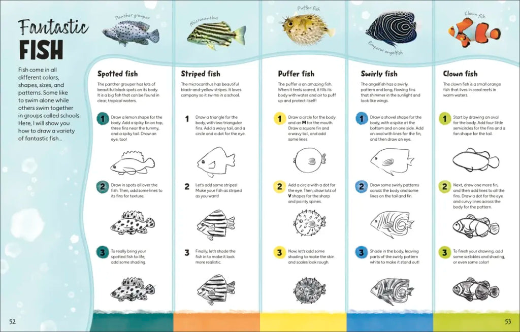 • Simple draw-along steps that are straightforward and sketchy, making it easy for children to follow along.