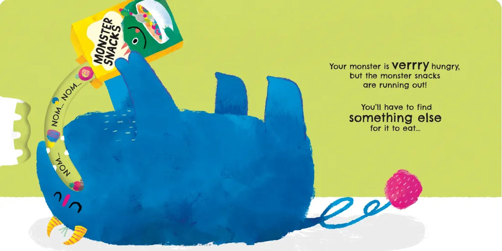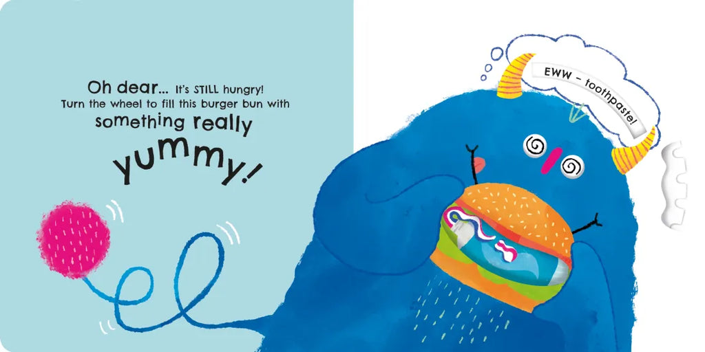 Turn the wheel to feed your monster in this hilarious, interactive book. As you rotate the wheel, different silly food options will appear on the page, and the monster's reaction changes.