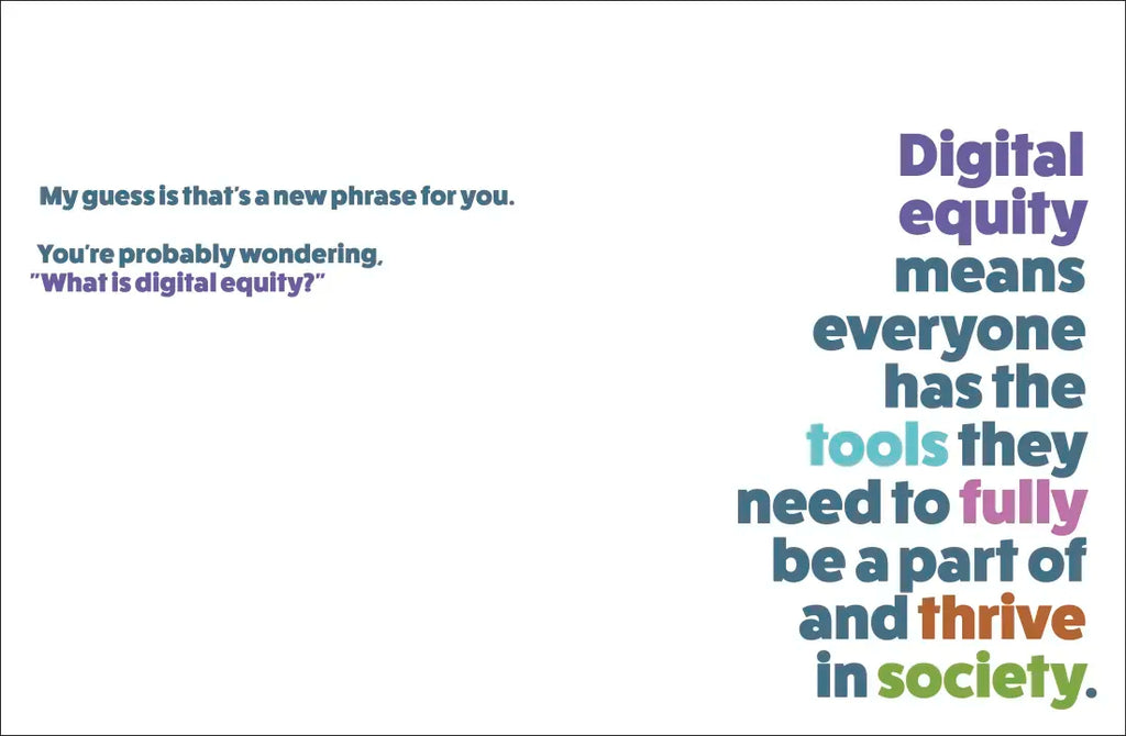 This is a kids’ book about digital equity. Phones, tablets, laptops, the internet: there are so many digital tools! But what happens when people can't access them? This is why the conversation about digital equity is so important.