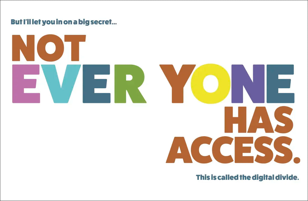 This book was made to help kids aged 5-9 understand the concept of digital equity: what it is and how it should work to ensure folks everywhere have access to the tools they need. Digital tools can help us to fully belong and succeed in today's digital world, so it’s vital that we work towards ensuring access for everyone!