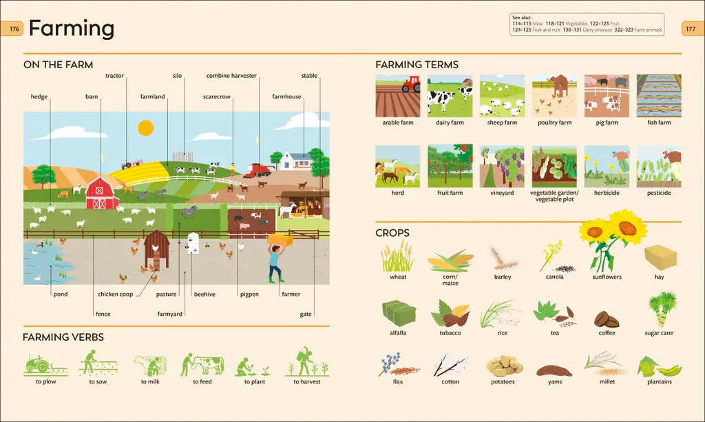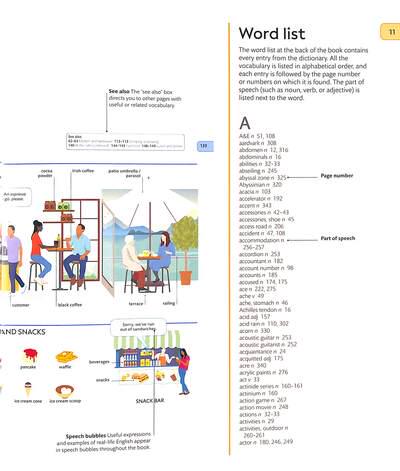 Children aged 7+ will find it easy to understand challenging words and build their English vocabulary with terms arranged in themed sections that cover practical, everyday topics – such as city life, sports, construction, farming, or visiting a bakery. Helpful cross-references allow children to look up other related terms quickly.