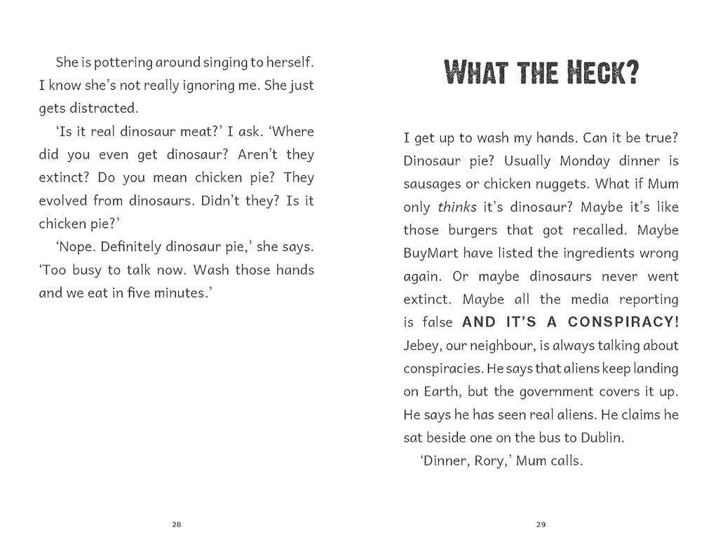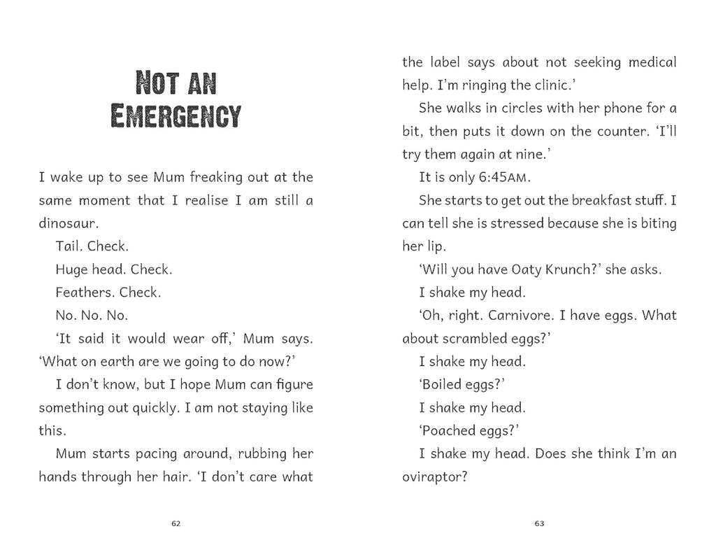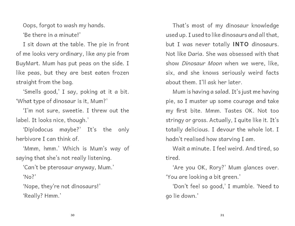It wasn't really Rory's mum's fault. She just bought Dinosaur Pie for a change and gave it to Rory for his dinner. The next morning he was a dinosaur. Not dressed up as a dinosaur - actually a dinosaur. It's not all that funny really. Rory can't talk and he can't bear the thought of eating an apple. All he wants to eat is sausages. It doesn't wear off. The supermarket that sold the pie doesn't want to know and the doctor isn't all that helpful. What are they going to do to get Rory to turn back into a human boy?