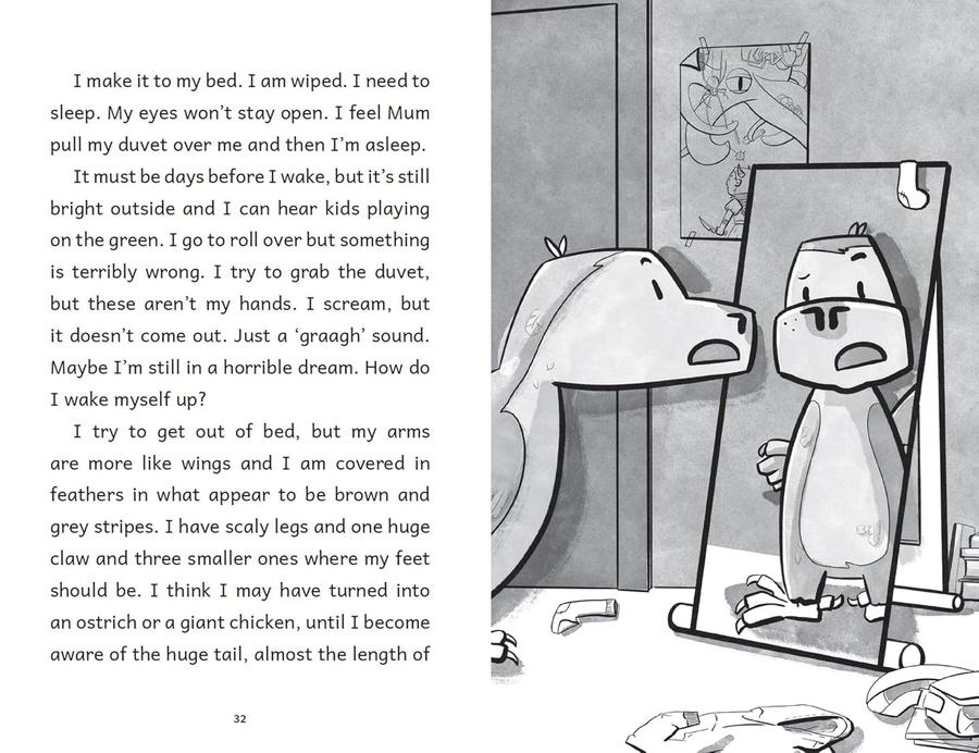 A hilarious and heartwarming chapter book for readers aged 6+ about a boy with ADHD who is transformed into a dinosaur, with dynamic black-and-white illustrations throughout.