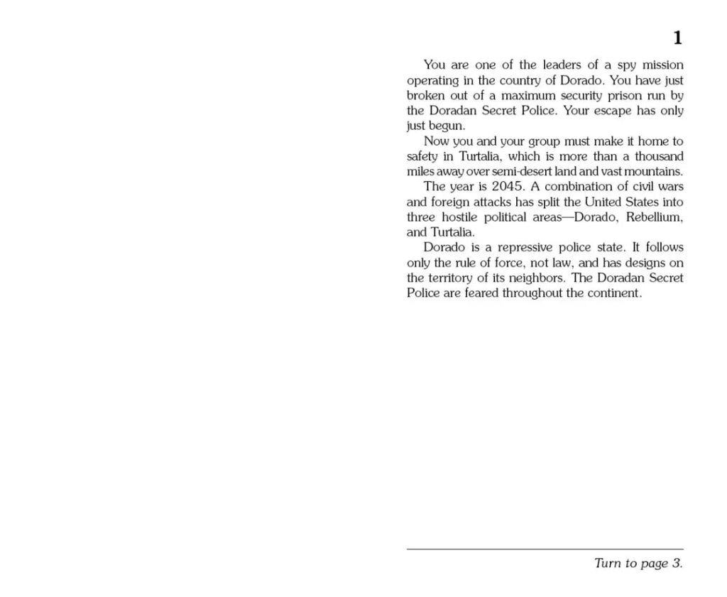 YOU have recently returned from a top-secret spy operation fighting to topple the so-called democracy in power. Your next mission sends you to Dorado, the repressive police state that now occupies what once was New Mexico, Arizona, and Texas. You must get information to the revolutionary leaders in Denver. If you don't make it, thousands of lives will be at risk. Should you brave the trip? Are you willing to risk everything—even your life— for the greater good, and the promise of freedom? Be careful, the choices YOU make might end in glory, disaster, or certain death.