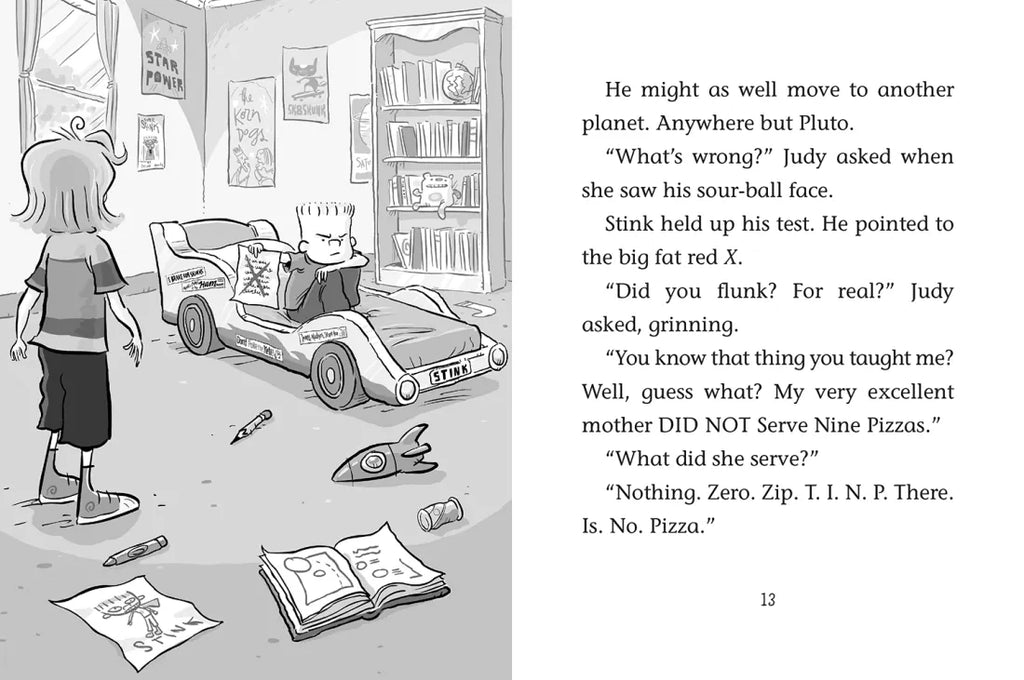 When Stink learns that Pluto has flunked out of the Milky Way for being too shrimpy, he feels like he might just explode with a Big Bang. Stink has no choice but to take a stand for the sake of little planets (and little people) everywhere. Will he be smart enough to defeat a panel of big-shot scientists? Will he be strong enough to beat know-it-all Riley Rottenberger and her "Team KPB"? Will he succeed in rescuing Pluto from a fate worse than being swallowed by a black hole? Start the countdown for a funny (and very informative) out-of-this-world adventure — and prepare to have your universe rocked!