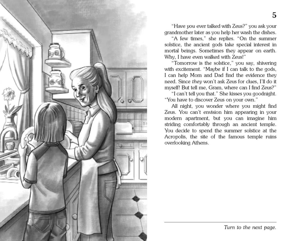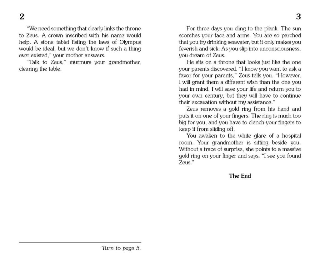 Your parents are archaeologists who believe they have unearthed the fabled Throne of Zeus, but they lack the evidence to prove it. On the summer solstice, the goddess Athena whisks YOU back in time to Ancient Greece to find the proof yourself. In your search for Zeus, will you fly with Icarus, battle the Minotaur, or swap lives with Hermes? Will you join forces with Hercules, sweep seashells for Poseidon, or play a game of fetch with the three-headed dog Cerberus? Be careful, the choices YOU make might end in glory, disaster, or certain death.