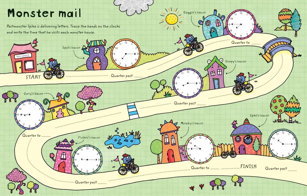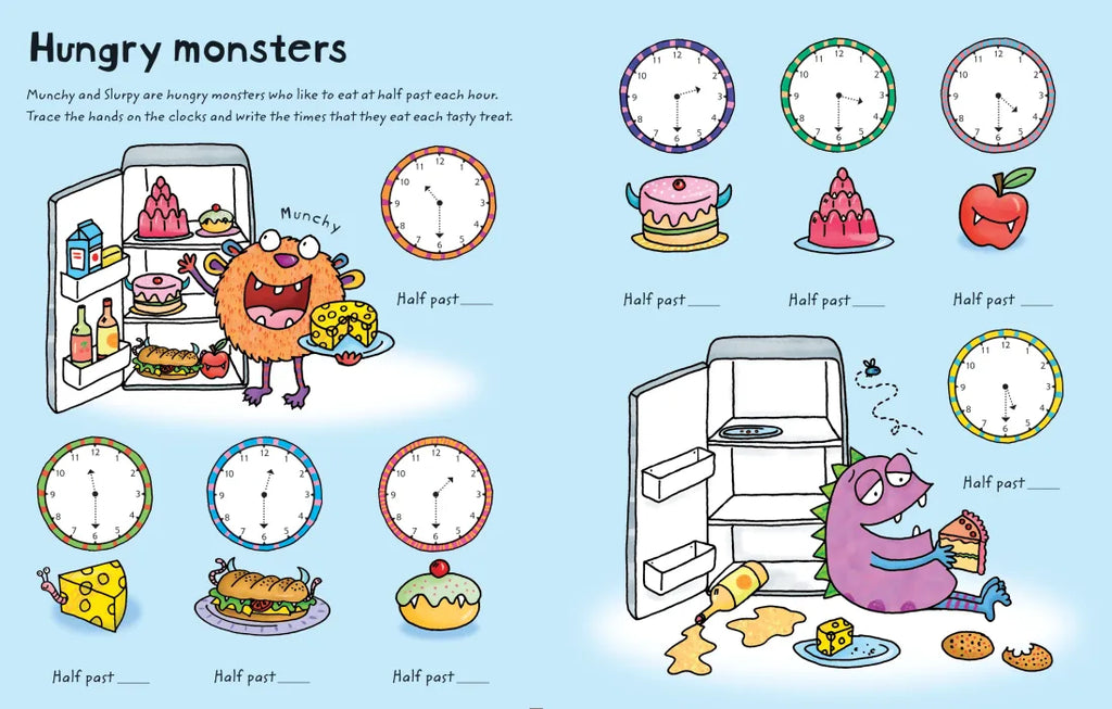 Children can join a host of friendly monsters and learn to tell the time in this fun, reusable book. The topic of time is introduced in a gentle and reassuring way, with clear illustrations and engaging activities. The durable, wipe-clean pages allow children to practise what they've learned again and again.