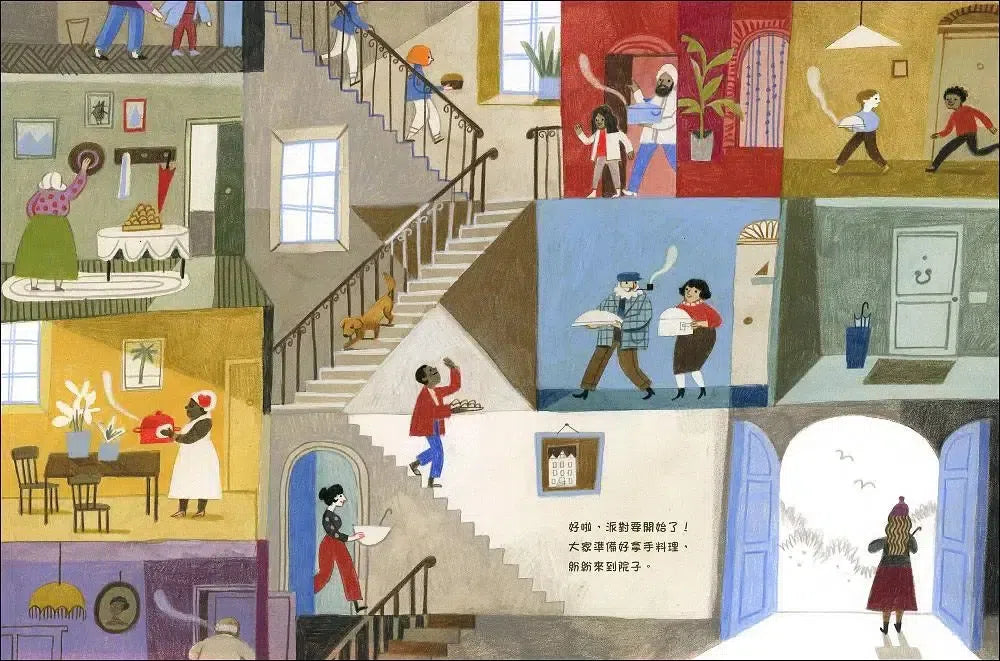 圖畫充滿豐富的細節,不論是廚房料理器具,主人的穿著樣貌,家居擺設和餐桌布置……都流露出家族、故鄉和文化的記憶,訴說著他們從哪裡來,以及食物如何滋養每個人的生活。