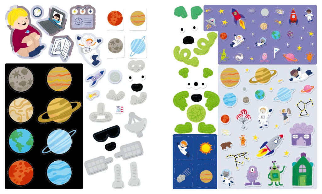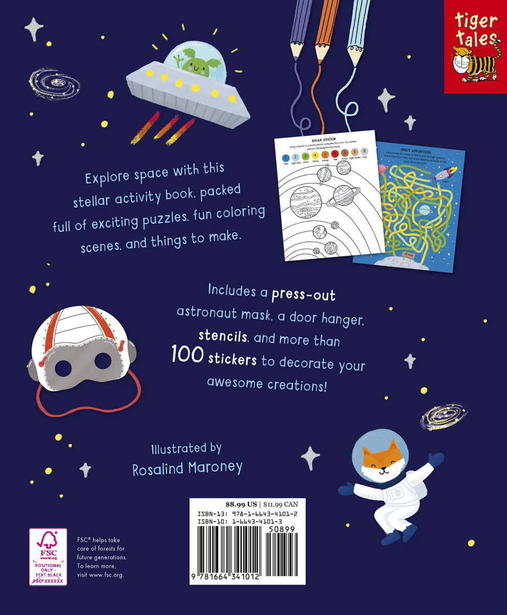 Young fans of outer space will have hours of fun with this activity book! Readers will love to complete the delightful puzzles, coloring scenes, and space-themed crafts that most children can do themselves and with common household items. This engaging activity book includes a press-out astronaut mask, a door hanger, space-themed stencils, and more than 100 colorful stickers for young artists to decorate their creations.