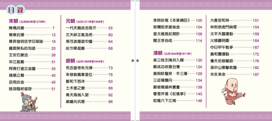 本冊為第四冊,講述了由宋朝至清朝的故事。著名的岳飛抗金、包公審案都是宋朝的歷史故事,宋朝還經歷了「靖康之難」,兩代皇帝被外族俘虜。宋朝之後,由蒙古族建立了元朝,最後由做過和尚和乞丐的朱元璋推翻,建立明朝。清朝是中國歷史上最後一個封建王朝,長達二千年的帝制是如何結束的呢?一起翻開本冊,在豐富的插圖中穿越歷史之旅吧!