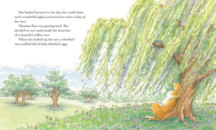 Every night before she goes to sleep, a kangaroo prays under the stars for a baby to love and hold. One day, as she rests under a tree, a baby bird falls out of its crowded nest—plop!—right into her pouch!
