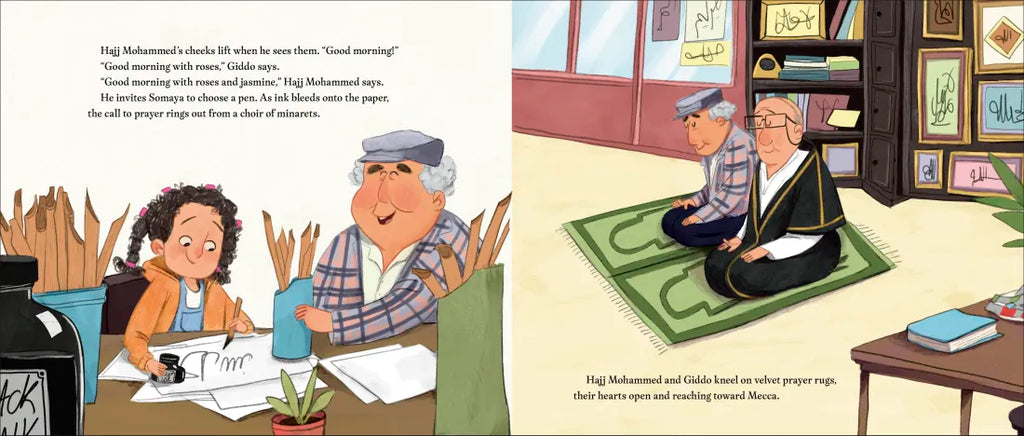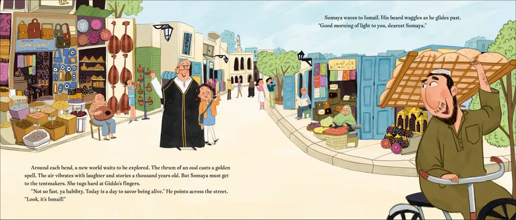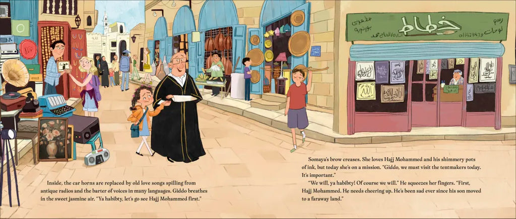 When Somaya and her beloved Giddo (Arabic word for grandfather) make their weekly trip to the market, Somaya is impatient to get to the tentmaker’s stall; she needs help to complete a birthday surprise for Giddo, but Giddo prefers to take his time to visit his many friends. At first Somaya is frustrated by the delay, but soon she sees the importance of checking in on friends. Like Hajj Mohammed who sells shimmery pots of ink and is sad since his son moved to a faraway land.