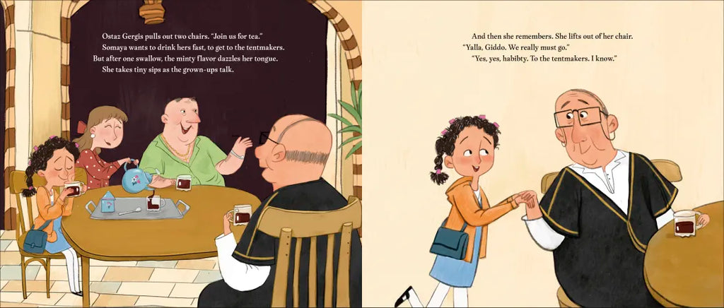 Next, they visit the jeweler. All around sparkling abalone fill baskets like treasure boxes. “Good morning of sweet cream, dearest Somaya,” Mariam says as she strings together a beautiful necklace. Giddo decides to stay for tea with Mariam’s father. Somaya loves listening to their chatter as the minty tea dazzles her tongue.