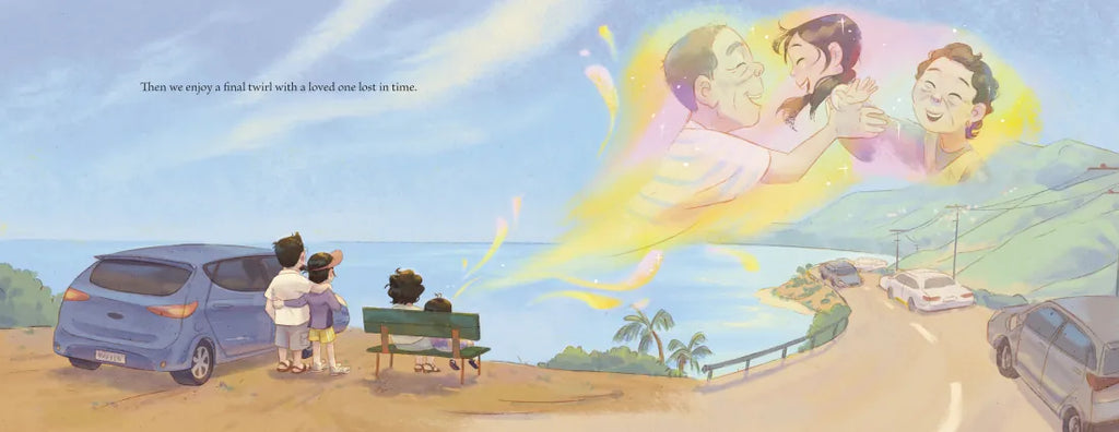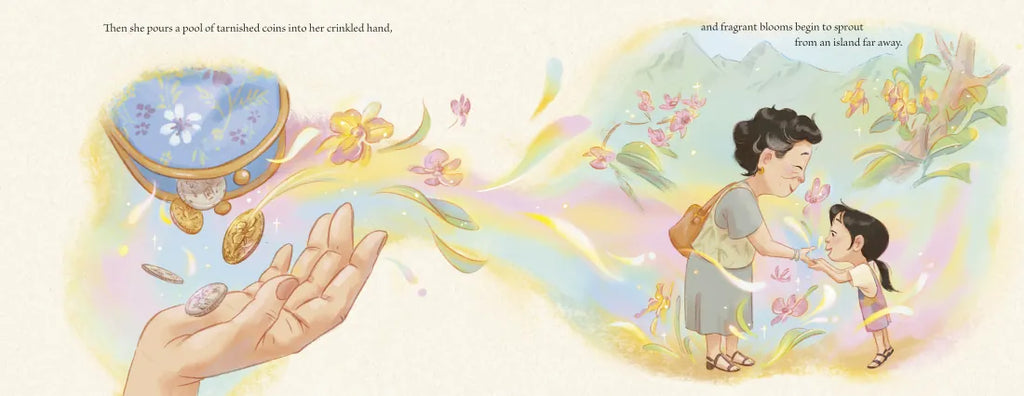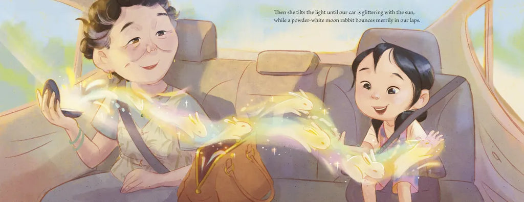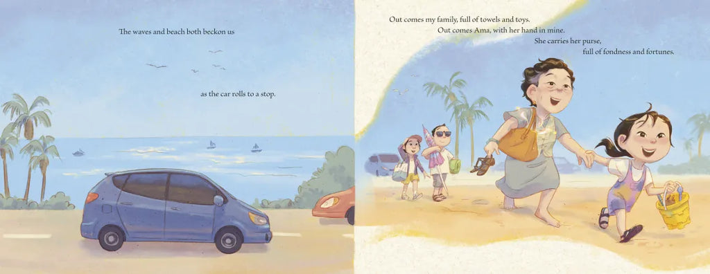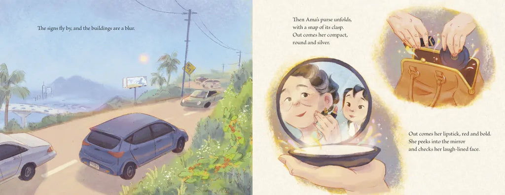 A young girl is just where she wants to be, next to her grandma in the back seat of the car as her family heads out on a day trip. She knows there are always delightful surprises inside Ama’s purse. Sure enough, out come all sorts of special items, one after another as the trip continues: a compact that frees a powder-white moon rabbit, tarnished coins that smell of island blooms, buddha beads that chime together like bells and drums. And best of all, a worn book of photos that brings cherished memories circling around them all.