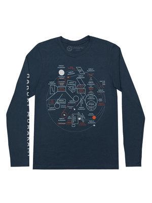 The Murakami Novels Map unisex long sleeve features Gall redesigning his series of Murakami covers to fit together in an abstract map that documents Murakami’s surreal worlds.