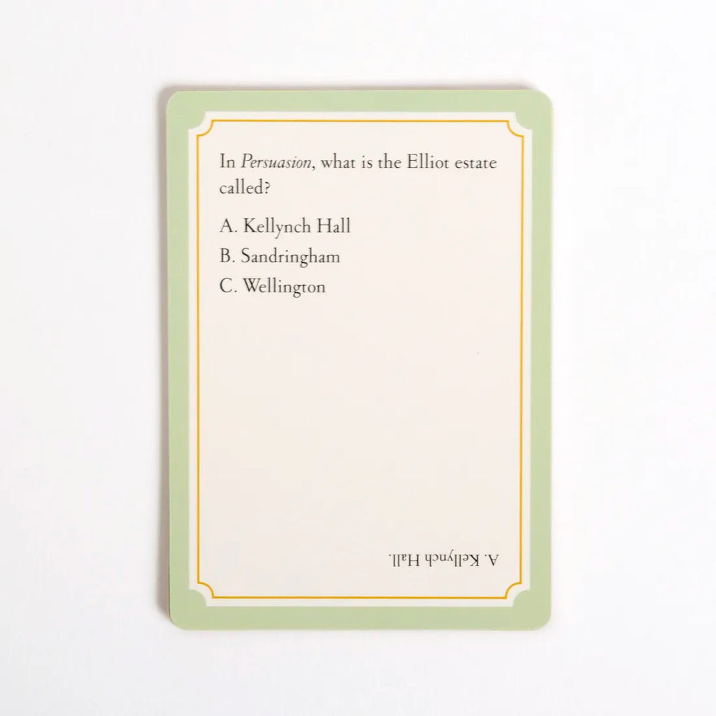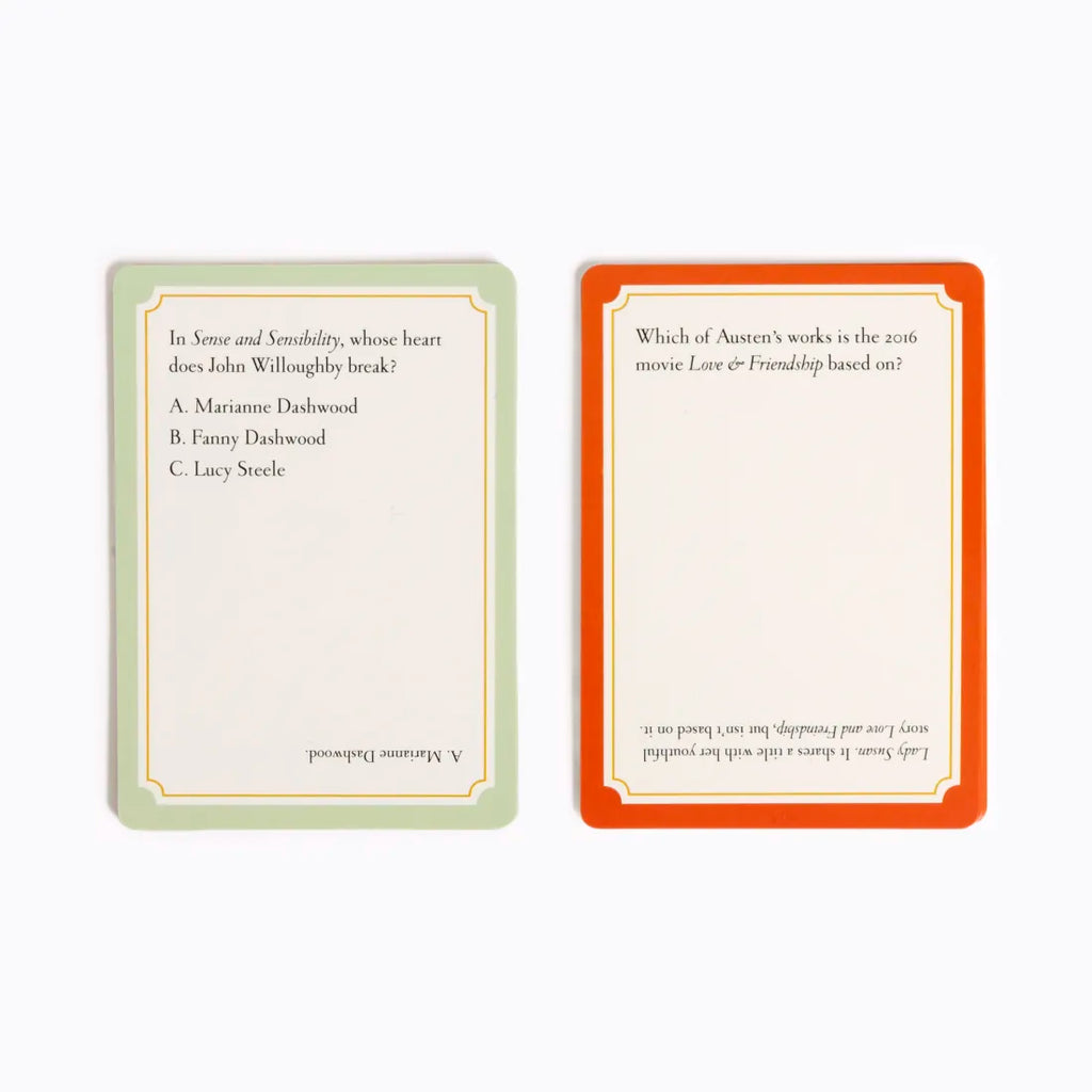 Test your knowledge of Jane Austen and her classic novels with the 400 questions in the Jane Austen Trivia card game and make it a truth universally acknowledged that you are the ultimate fan, featuring an instructional booklet outlining different ways to play.
