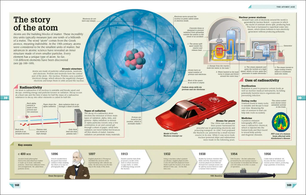 You’ll meet influential inventors and famous faces from the past, including Aristotle, Leonardo da Vinci, Isaac Newton, Charles Darwin, Marie Curie, and Stephen Hawking. You’ll visit places of scientific importance, such as prehistoric cave art, Stonehenge, Hiroshima and the first atomic bomb, the Moon landings, and the Higgs boson particle. These huge events are made simple thanks to eye-catching images, helpful timelines, and accessible, informative text.