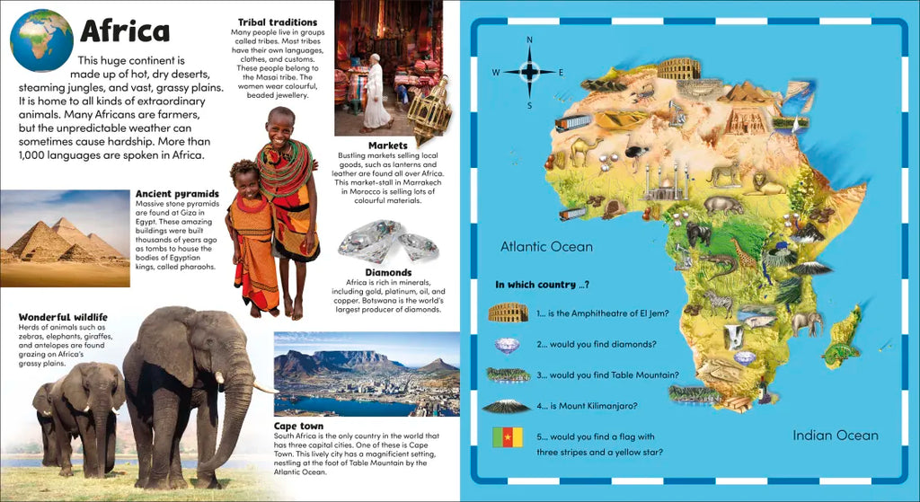As you explore the world, you’ll learn about flags, native animals, local produce, populations, and great sites to visit. Don't forget to test your knowledge of the continents and the places you visit with fun quizzes!