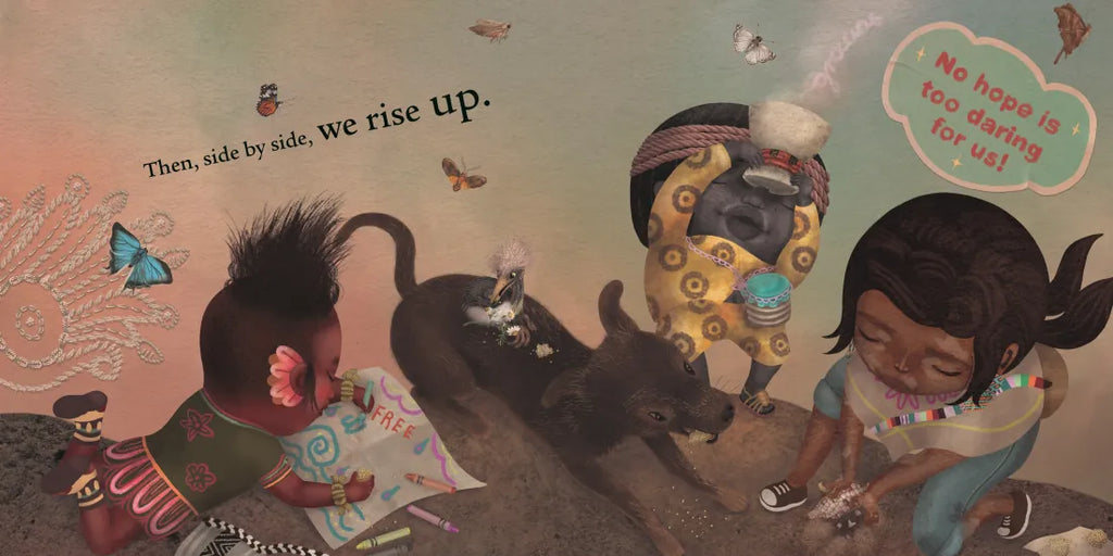 Playing together in good times leads to working together through trouble. When the local lagoon dries up and a bird friend is trapped in the dry bed, the little rebels call on ancestors to show them what to do. Nobody gets left behind.