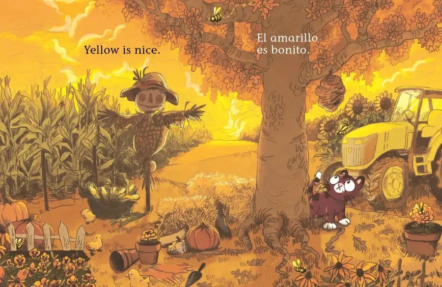 Cat learns about red, blue, and all the colors in between–and meets new friends along the way–in this adorable bilingual board book full of color vocabulary and feline fun!