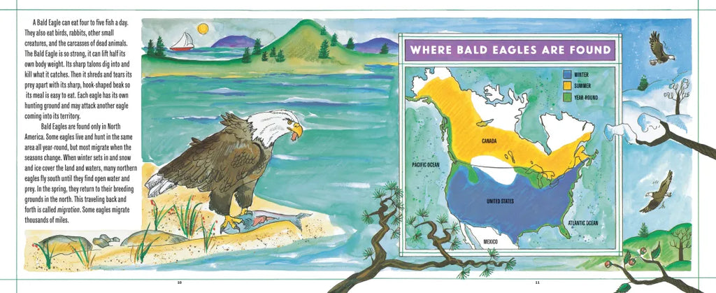 Well-labeled diagrams and illustrations show the physical traits of Bald Eagles, how they fly, where they live, how the raise their young, and much more. A page of fun facts about Bald Eagles is also included.