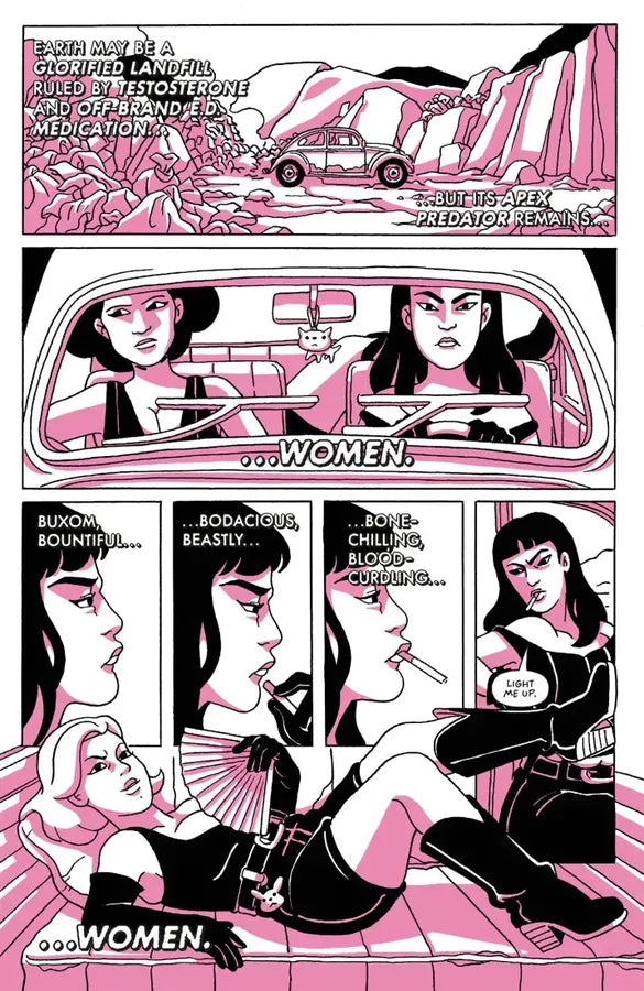 Welcome to the future. Earth may be a glorified landfill ruled by Neo-Reaganism, testosterone, and off-brand ED medication but Earth’s apex predator remains: big, buxom, bountiful, bodacious, beastly, bone-chilling, blood-curdling…WOMEN.
