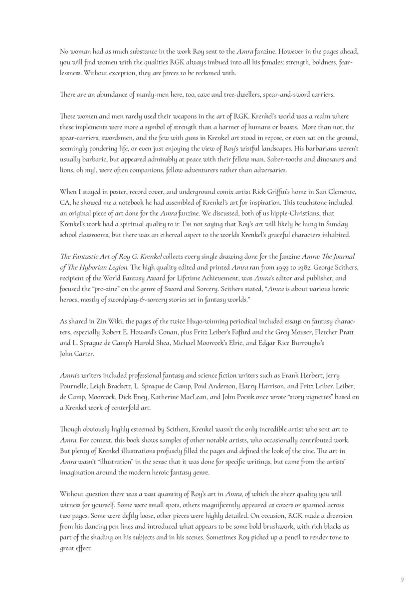 Now at last, the complete Amra illustrations are lovingly gathered from the rare ’zine to inspire and enthrall artists and art lovers. Fantastic dinosaurs, ape men, barbarians, cavemen and women, citizens of ancient civilizations, and saber-toothed tigers populate the luxurious pages of this stunning tome as only Roy G. Krenkel can deftly embellish them.