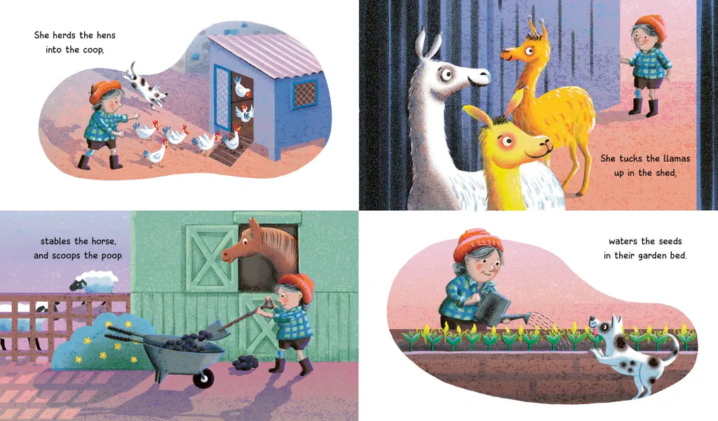 There are plenty of chores on the farm, and the farmer has the routine down to a science. When she’s done at the end of the day, her reward is a cozy pair of pajamas and a good night’s sleep. But today, and the next day, and the next, the farmer’s favorite pajamas go missing, and she can’t sleep a wink. What can go wrong? Everything! As comical chaos escalates—milking the horse! Piglets in the coop! Feeding the chickens a scooper of poop!—the concerned farmyard creatures organize a four-footed search party to help the exhausted farmer. Can they find what she needs? Told with bright, expressive artwork and a bouncy sing-song text, this hilarious comedy of errors will have little listeners in fits of giggles and calling for repeat farmyard visits.