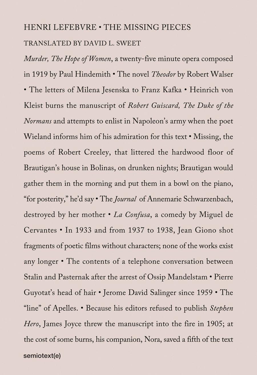 The Missing Pieces is an incantatory text, a catalog of what has been lost over time and what in some cases never existed. Through a lengthy chain of brief, laconic citations, Henri Lefebvre evokes the history of what is no more and what never was: the artworks, films, screenplays, negatives, poems, symphonies, buildings, letters, concepts, and lives that cannot be seen, heard, read, inhabited, or known about. It is a literary vanitas of sorts, but one that confers an almost mythical quality on the enigmatic creations it recounts—rather than reminding us of the death that inhabits everything humans create.