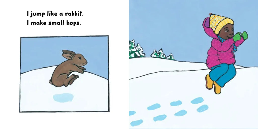 Olivia and Mei jump in the snow all the way to the tall tree. Mei takes a few big leaps like a deer. Olivia makes lots of smaller hops like a bunny. Each jumps “more” in a different way. A playful exploration of measurement, proportion, and friendship.