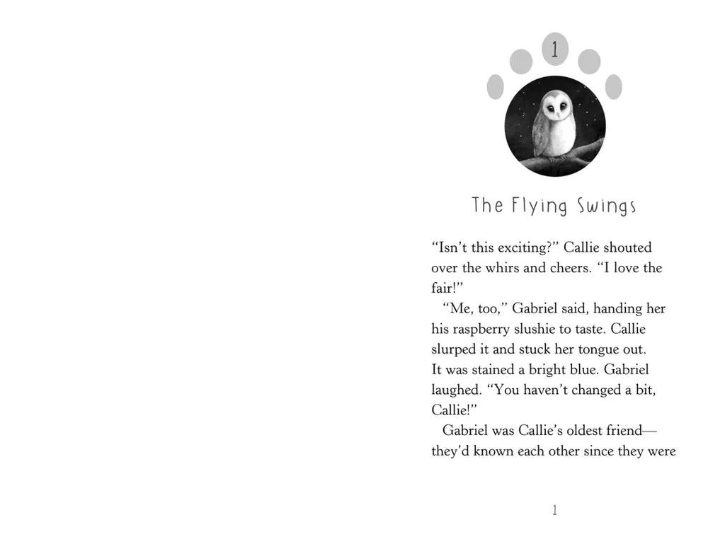 One night at the carnival, Callie and her friend Gabriel decide to go on the flying swings. As they spin higher and higher in the air, Callie suddenly feels huge gusts of wind, and she can’t see anything in front of her. When the ride stops, she finds herself alone on an expanse of farmland. She knows that she has been brought there to help an animal, and soon, she discovers a barn owl family. Then the mother disappears and leaves an owlet behind! Knowing she must do something to help the baby bird. Callie leaps into action. But with night closing in and dangerous animals all around, Callie will need her tiny friend’s help as much as it needs hers....