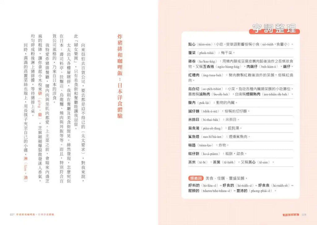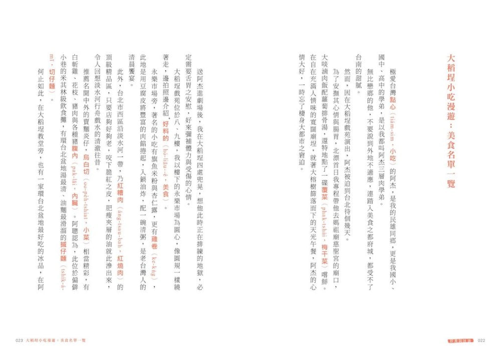 前八章前後切分為「主文」與「字詞整理表」,供讀者對照參考。每篇主文一千多字出頭,文末字詞整理表約二十字,全書收錄近一千組台文字詞。