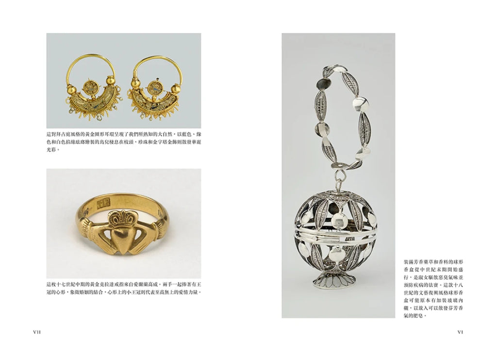 從蘇美女王的黃金耳環,到傳奇巨星的鑽石手環;從維京人的銀項圈,到印度傳統的頭巾帽珠寶;從各民族祈求庇護的護身符,到名流政要宣示信念的胸針……在這本燦爛的文明故事集中,每一件首飾都是文明留下的閃亮註腳。你將看見珠寶如何映照價值觀的與時俱進,同時也傾訴著人類最深刻的情感與信念:愛與連結、認同與承諾。