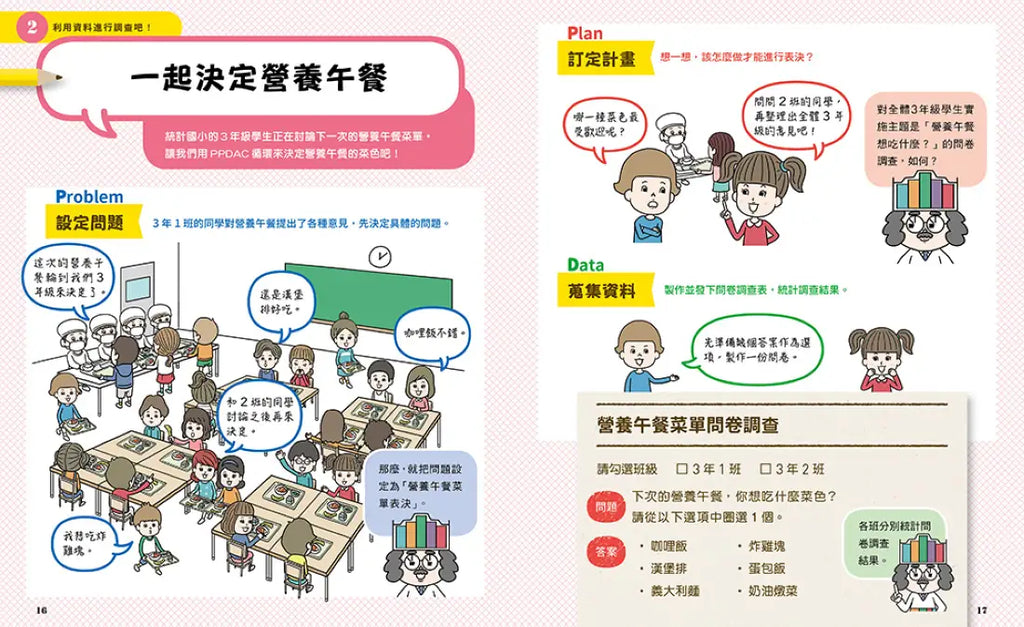 本書的另一特色,便是建立孩子對於「PPDAC」的概念,即透過「設定問題」、「訂定計畫」、「蒐集資料」、「進行分析」以及「提出結論」等5大調查步驟的循環,利用實際的資料來解決生活中的各種難題。