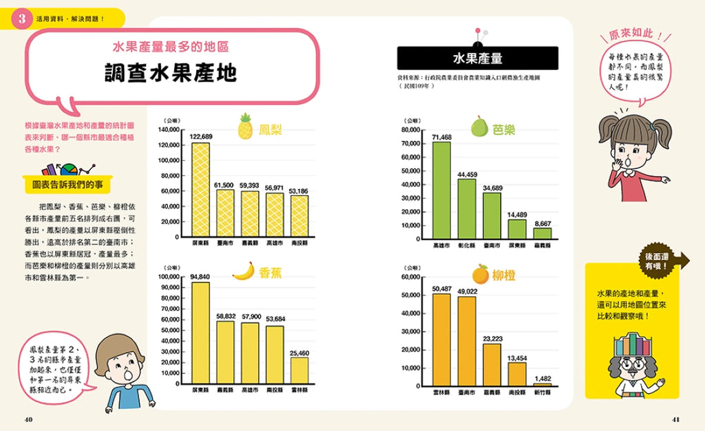 本書符合108課綱跨領域學習的素養精神,以生活中各種情境為例,引導孩子對資料來源進行統整與解讀,包含調查各縣市的水果產量、統計不同動物所需的睡眠時間等,在社會、自然等各個領域中運用統計圖表,並在判讀統計圖表的同時進一步思索生活中的相關議題。