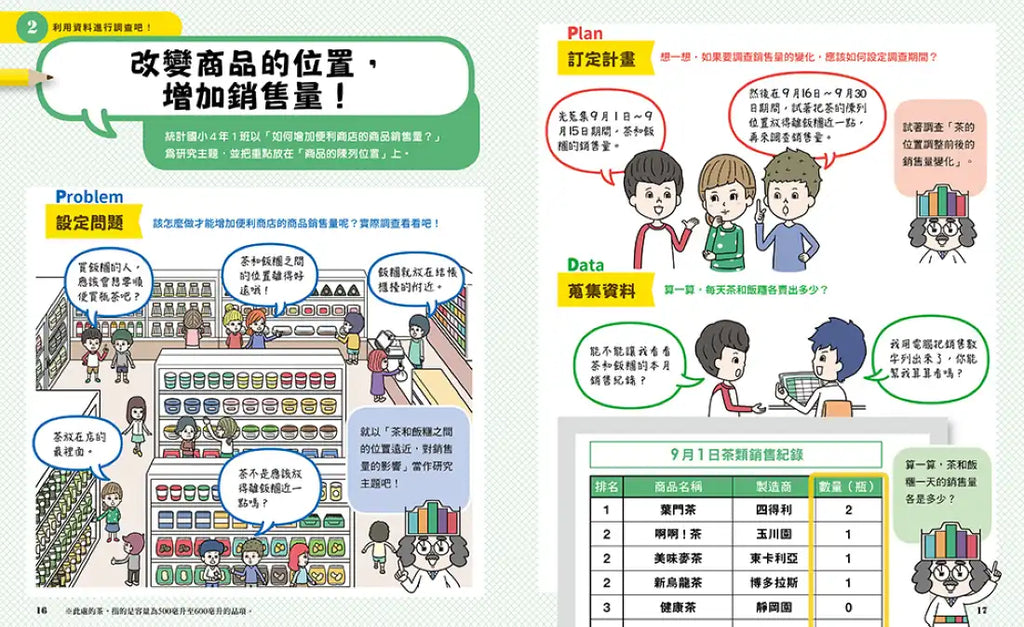 本書的另一特色,便是建立孩子對於「PPDAC」的概念,即透過「設定問題」、「訂定計畫」、「蒐集資料」、「進行分析」以及「提出結論」等5大調查步驟的循環,利用實際的資料來解決生活中的各種難題。