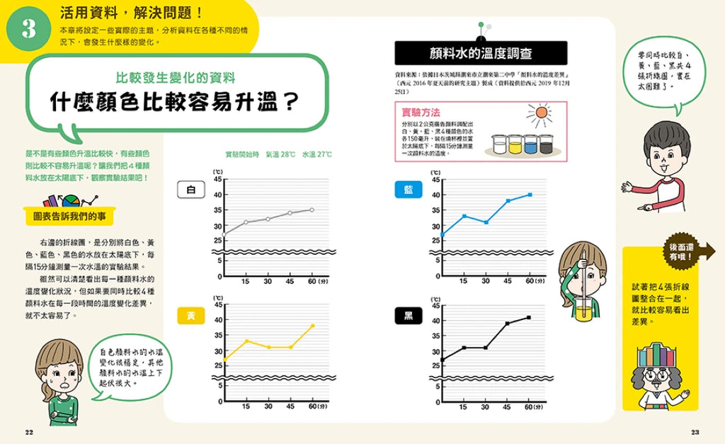 統計的實用,正是來自於它能為生活中各種難題提出解決方案。如書中舉出的例子,像是「什麼顏色的顏料水比較容易升溫?」或是「某地七月的溫差變化程度有多劇烈?」等問題,其實只要動手整理出一個簡單的「折線圖」,就能輕鬆找到解答;若是再更進一步,合併使用折線圖與長條圖,不僅能夠同時呈現2種以上的資料,數值變化的趨勢也會顯示出來,幫助我們進行後續的預測判斷。