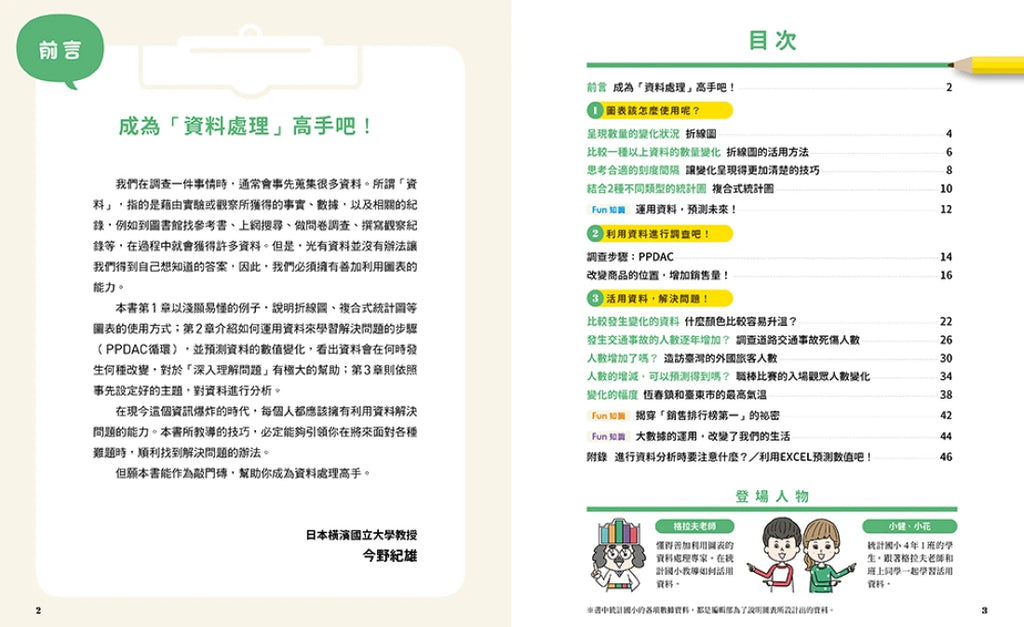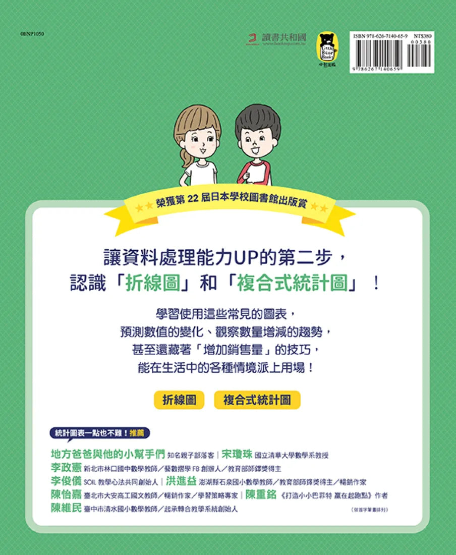 而「小學生的統計圖表活用術」系列誕生的目的,便是為了引領更多人進入統計的世界,感受這種靈活運用知識的樂趣。就由《小學生的統計圖表活用術:叫我資料小達人2.預測數值變化》為契機,進一步學習「折線圖」與「複合式統計圖」,繼續探索趣味橫生的資料處理國度吧!