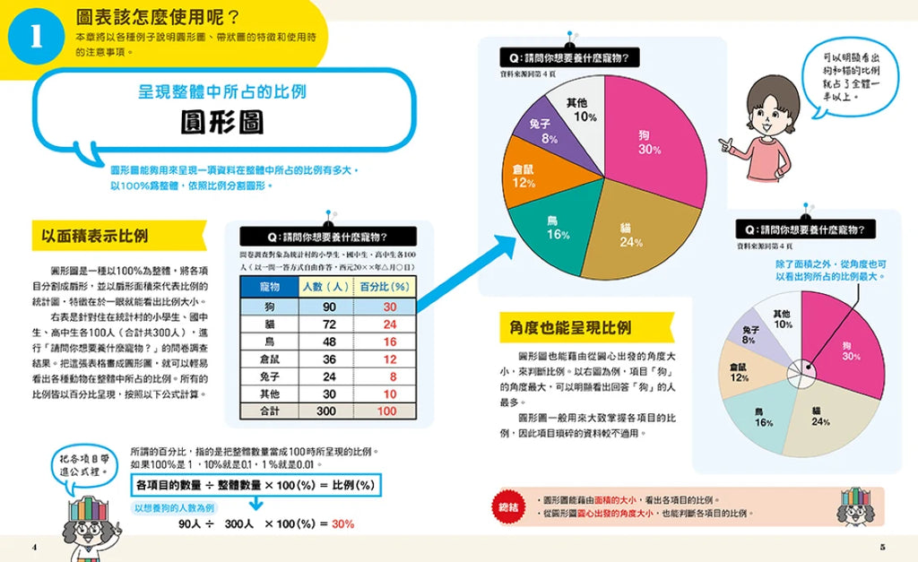 統計的實用,正是來自於它能為生活中各種難題提出解決方案。如書中舉出的例子,像是「在三個不同的年齡段中,受歡迎的寵物分別有哪些?」或是「六個年級裡哪個運動比賽項目最受歡迎?」等問題,只要將數據轉化成百分比,再視情況製作成「圓形圖」或「帶狀圖」,就能輕鬆找到解答;有時候使用長條圖很難分析的數據,換成圓形圖或帶狀圖就能一目了然,熟知各個圖表的特性,就能組合運用不同的圖表,進行更加全面的分析。