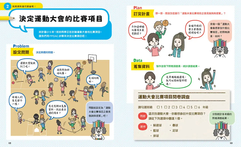 本書的另一特色,便是建立孩子對於「PPDAC」的概念,即透過「設定問題」、「訂定計畫」、「蒐集資料」、「進行分析」以及「提出結論」等5大調查步驟的循環,利用實際的資料來解決生活中的各種難題。