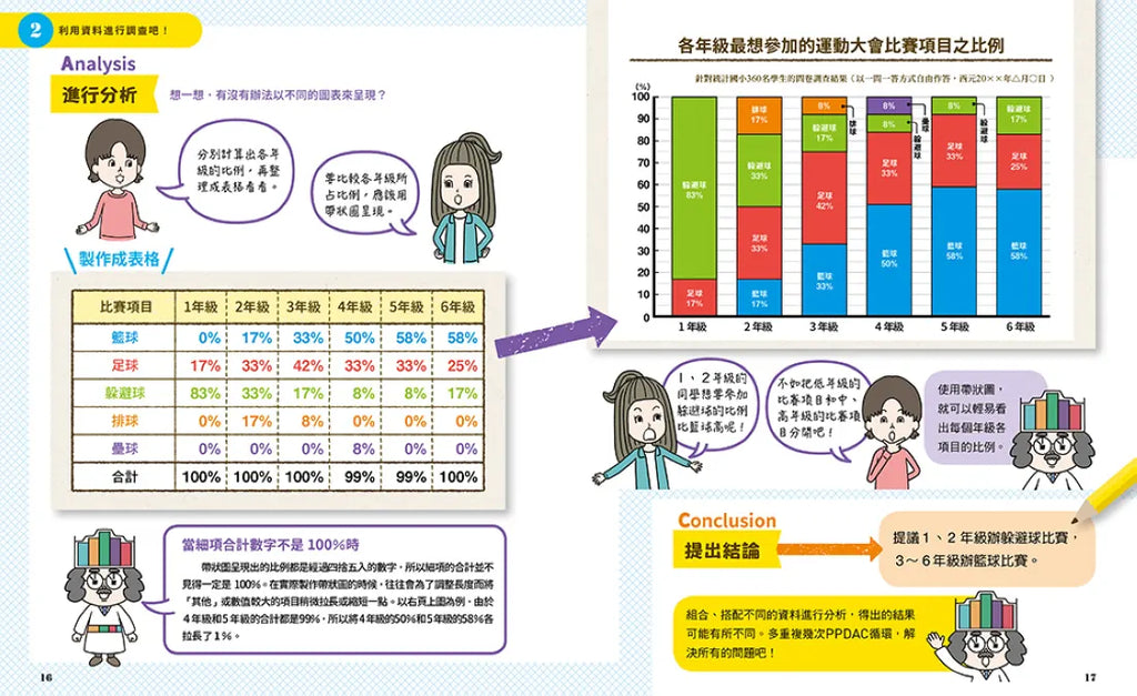 在本書第二部分「PPDAC」的單元中,統計國小5年1班的同學為了決定運動大會的比賽項目,用問卷調查蒐集了全校學生的意見。第一次他們將各項目的得票數製成長條圖來比較數量,得到票數最多的「籃球」是最受歡迎的結論;然而,得票數最多,就代表每個年級的學生都喜歡籃球嗎?當他們深入探究,將各年級的投票結果製成帶狀圖,才發現在一、二年級籃球的得票率竟然分別只有0%和17%!如果讓一、二年級的學生打籃球比賽,他們一定會很不開心吧!
