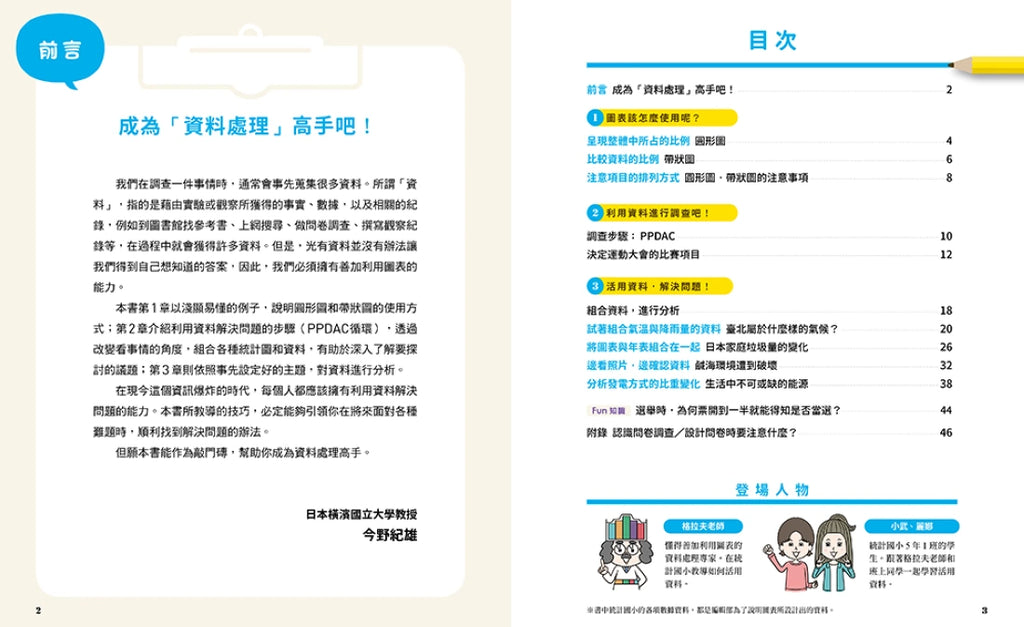 「小學生的統計圖表活用術」不只是一套介紹統計的素養導向書籍,更能啟發孩子對於大數據的認識與敏感度,非常符合現今培養孩子素養能力的教育潮流,尤其書中介紹的PPDAC循環,更是提供孩子問題解決的超棒眼界與方法。非常建議親子共讀,因為書中的方法不只對孩子有用,對於我們工作上的問題解決也是良方。想知道超棒的PPDAC是如何運作的嗎?快快翻開本書來看看吧!──鍾元杰(桃園市東興國中數學教師)