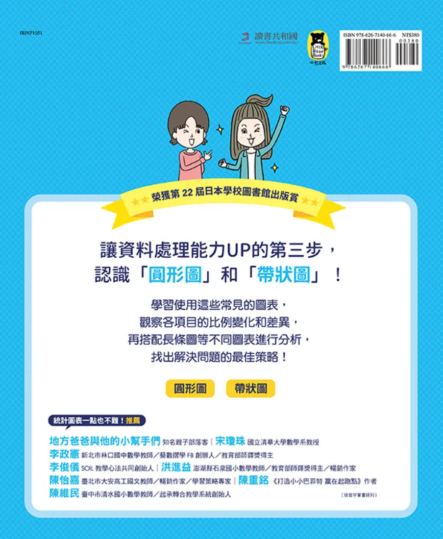 而「小學生的統計圖表活用術」系列誕生的目的,便是為了引領更多人進入統計的世界,感受這種靈活運用知識的樂趣。由《小學生的統計圖表活用術:叫我資料小達人3.分析圖表組合》為起始,深入認識「圓形圖」與「帶狀圖」,繼續探索趣味橫生的資料處理國度吧!