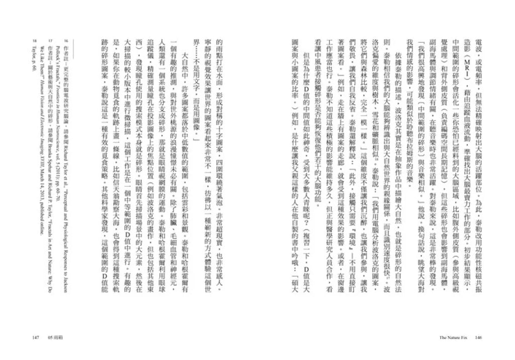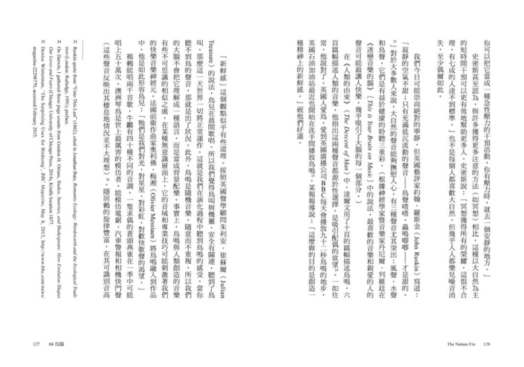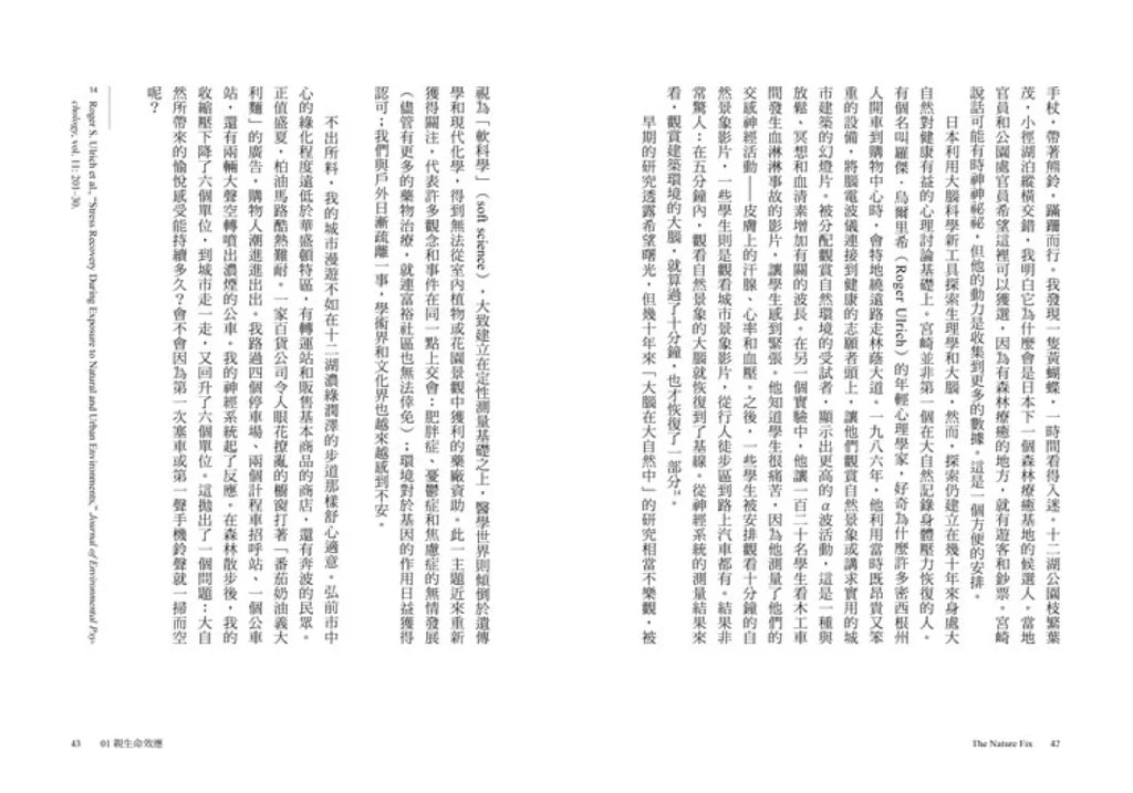 作者訪遍歐美亞三大洲,為了證實大自然於人腦人體的正向力量。時至今日,多數人已無法從城市撤回鄉村,也無能叫大自然力量接管城市,至少挪出一些空間,將大自然的元素注入日常生活,讓大自然展現一己的威力。當城市綠意更茸密時,極端的濕度和溫度將獲得平衡,縱使遇到各種自然災害中,城市也能有韌性地迅速恢復,不僅可為蟲魚鳥獸提供庇護,包括非生態系一環的我們也能被護衛著,各種身心症候將有機會獲得紓緩,臻至康建。