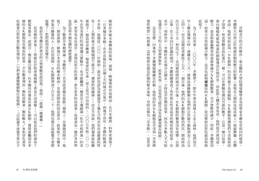本書作者從世外桃源的科羅拉多州移居美國首府華盛頓,對生活中自然環境體驗不足有了切身感受,於是花了兩年時間以全新角度投入研究,橫跨歐亞美三大洲,查訪生物學家、心理學家、神經科學家的最新實證研究,跟隨護管員和樹療師體驗森林療癒計畫,探索大自然對於大腦的正面影響背後的科學。